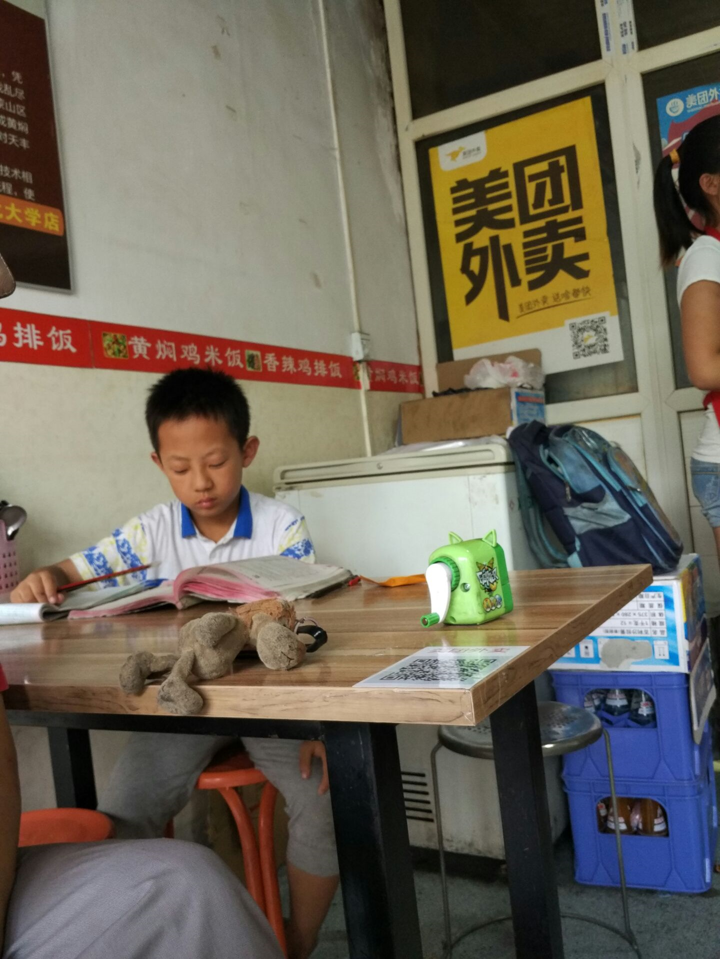 就在这时,有个小居安村村民(我推测和他们挺熟的)来买鸡排饭,大人们都热情地打着招呼。居安看见小男孩儿在写作业,就说:“娃写作业认真得很啊”。我想他肯定也看出了小男孩儿红红的眼眶,猜测到了发生的事情,出于好心,照顾孩子情绪,才这样说的。