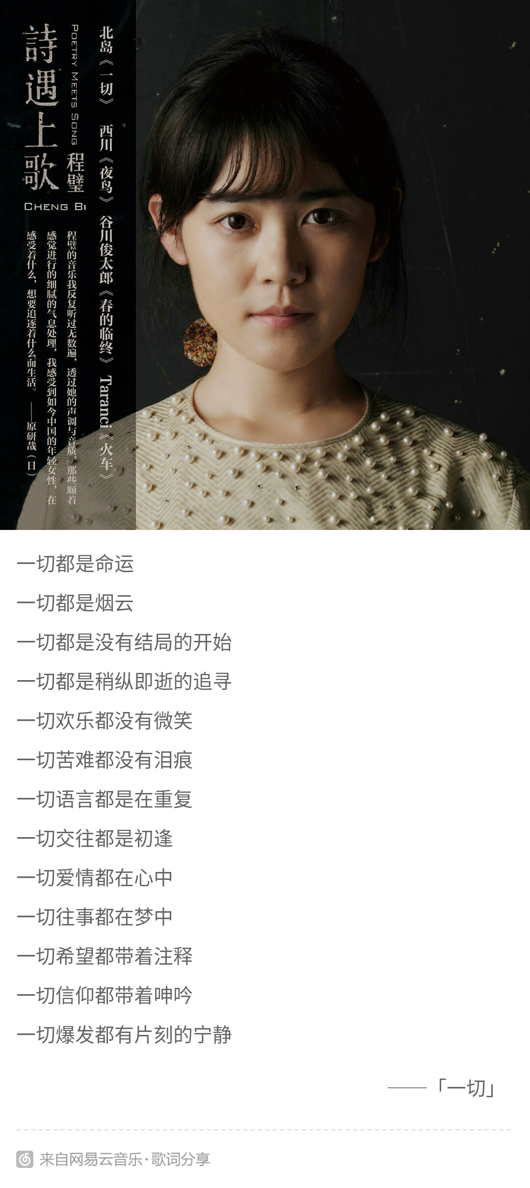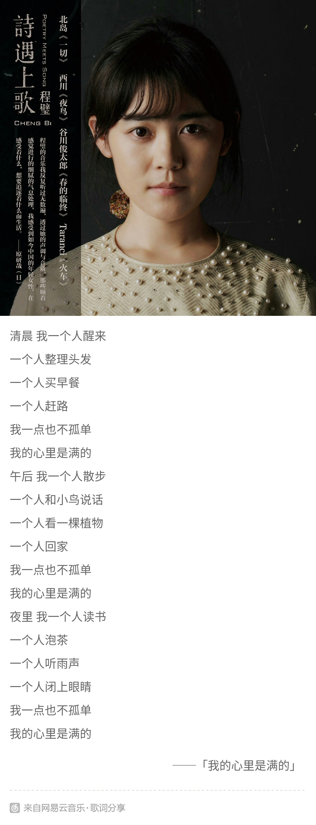 我在网易云音乐上找到了一个歌手,她叫程璧。她真的很有才,在我心中就像**一样。她是一个旅日歌手,她把自己写的诗做成歌词,凭借自己的一把古典吉他和朋友们的其他乐器创作出了很多美丽的歌曲。